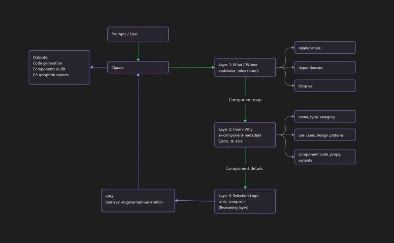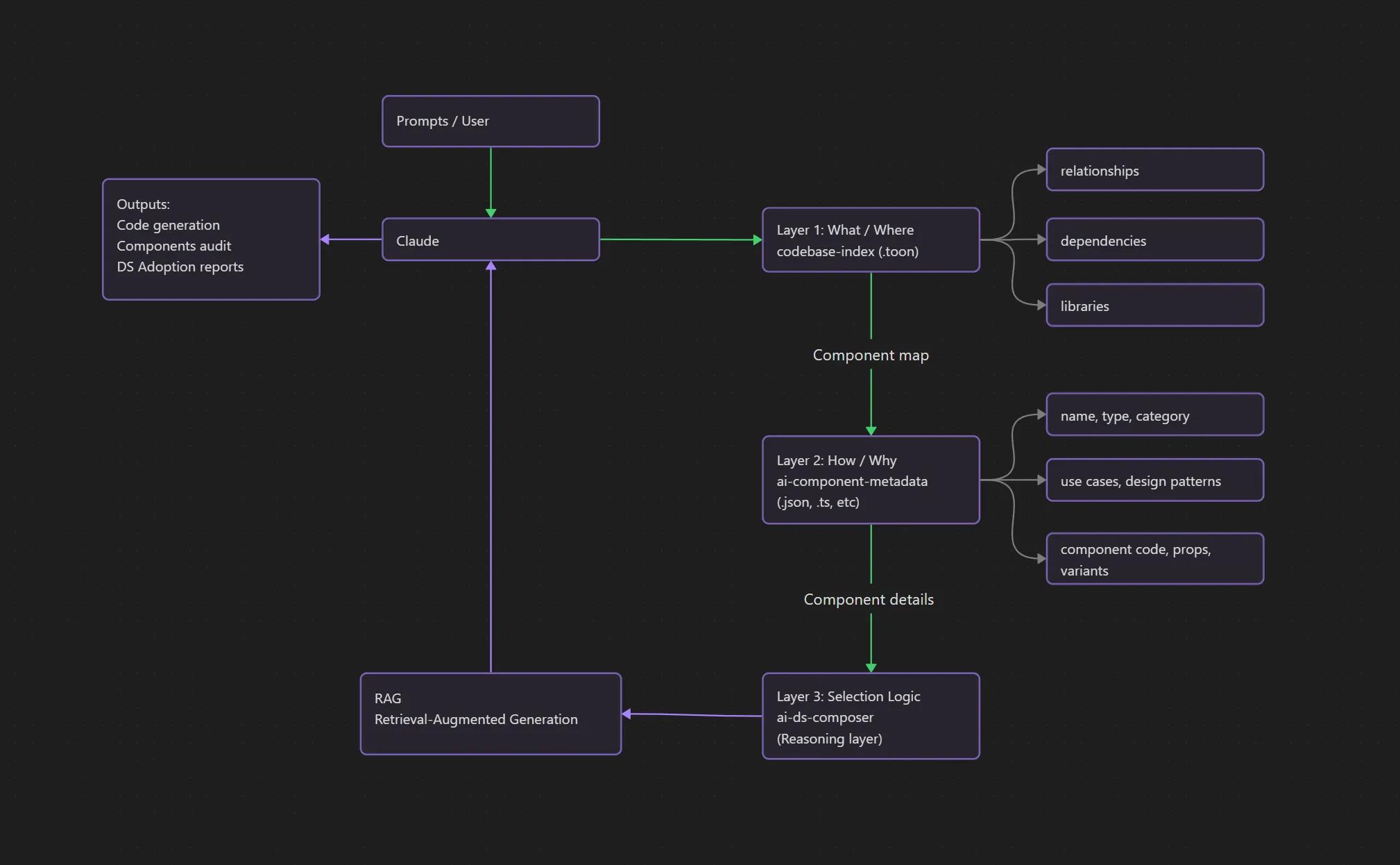 AI needs structured machine-readable context. Not "here's what Button looks like" but "here's when to use Button vs Link, here's the anti-patterns, here's how it composes with other components."
