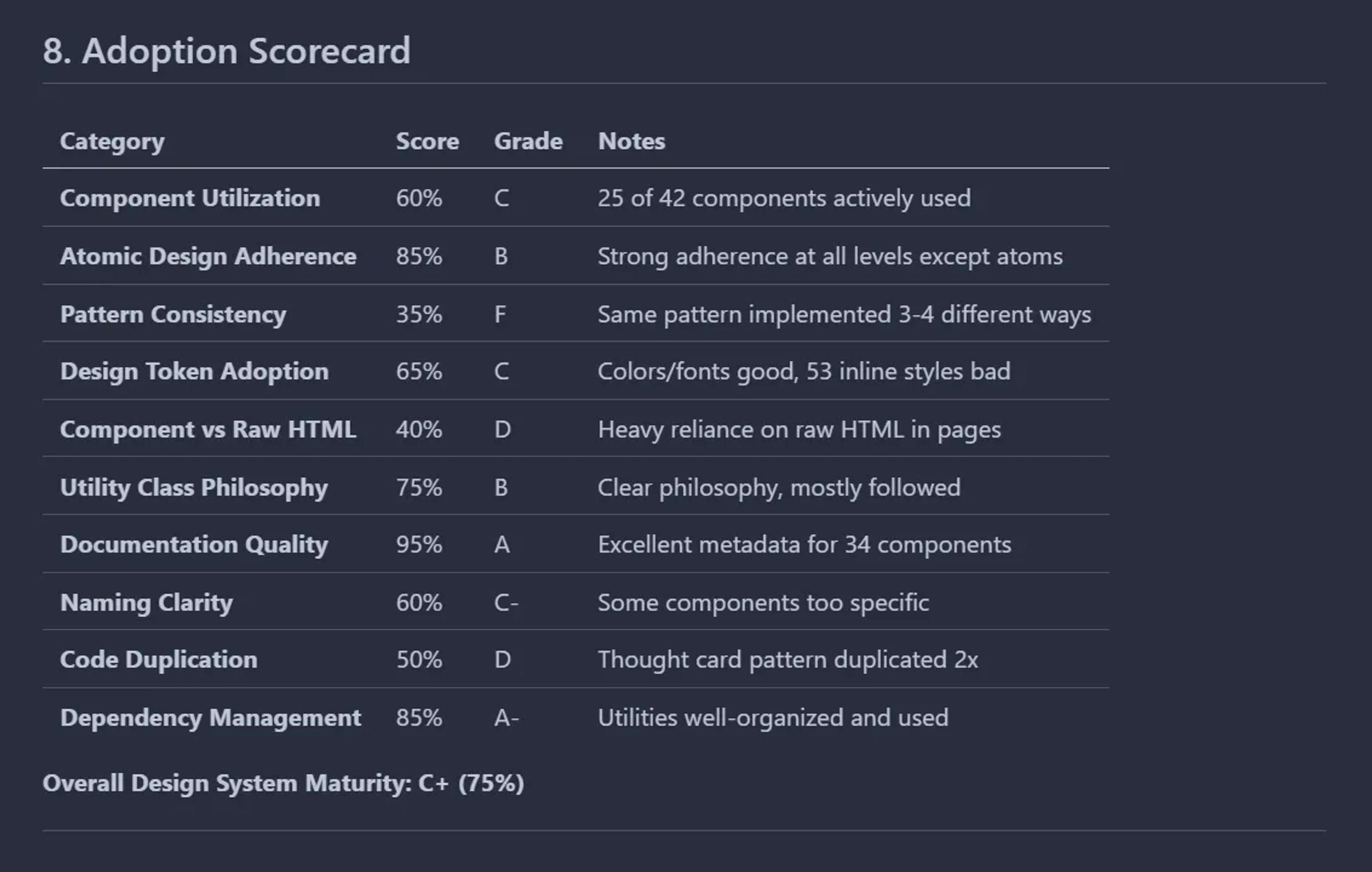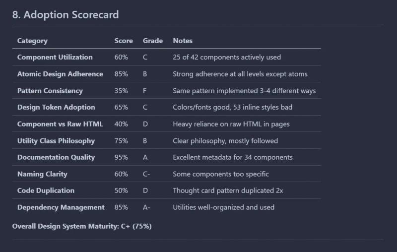 Ten minutes later: a 1,200-line comprehensive analysis. Component utilization rates, unused components, pattern inconsistencies, specific refactoring recommendations. Even with errors, phenomenal starting point.