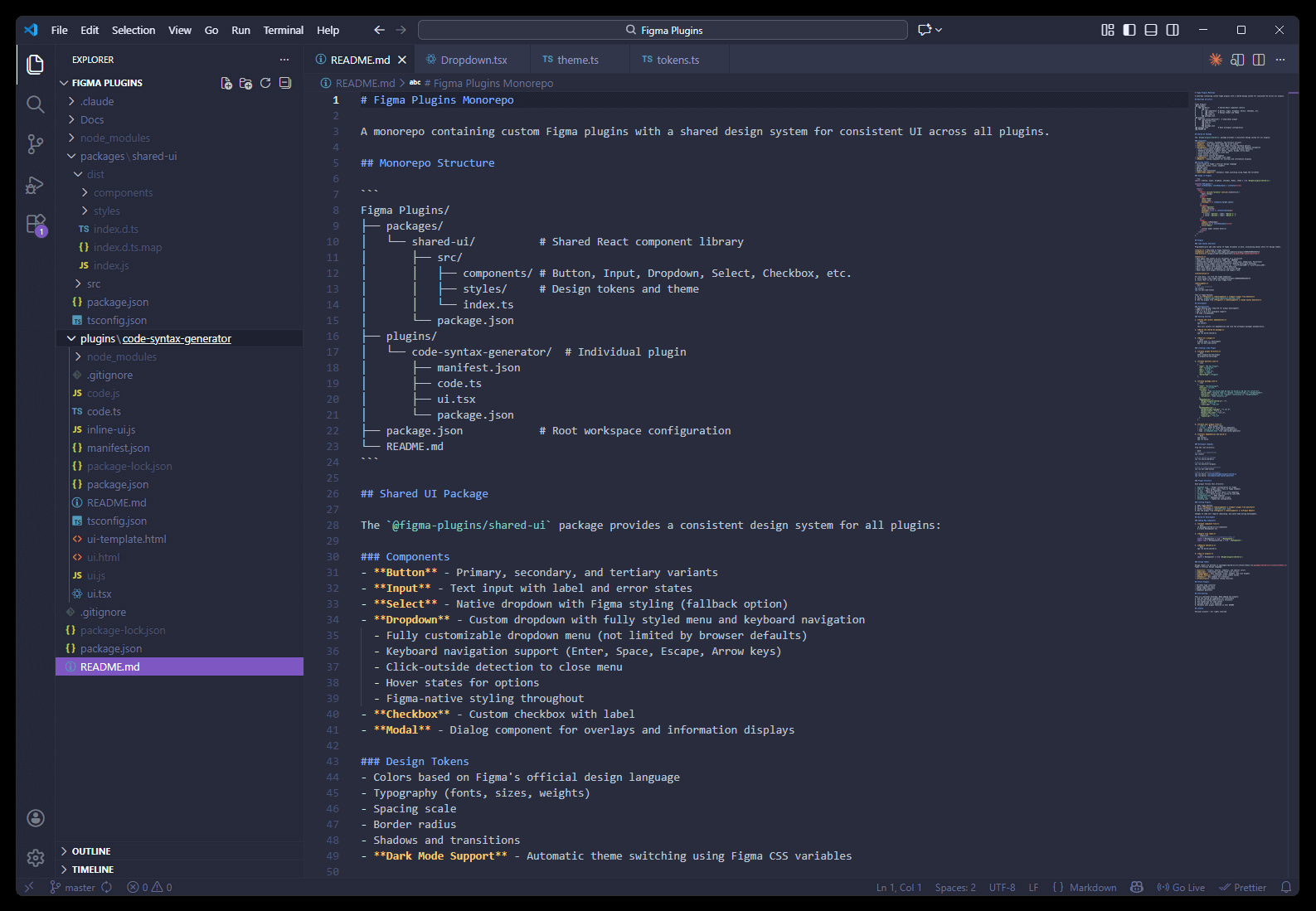 Claude generated the workspace setup. Root package.json with npm workspaces. A packages/shared-ui directory for the component library. A plugins/code-syntax-generator directory for the actual plugin.