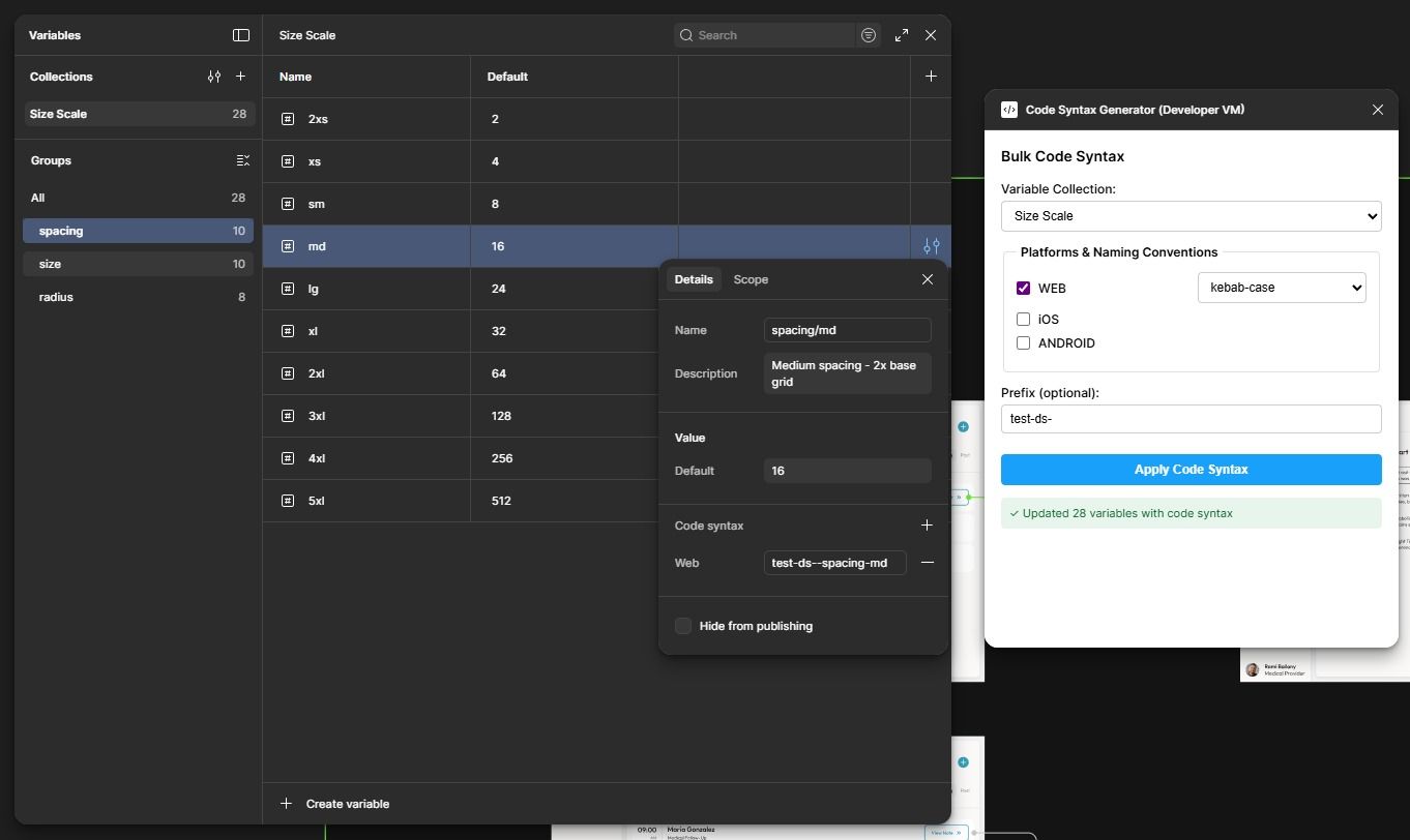 Code syntax is what lets developers reference your design tokens in their codebase. You need to specify platform (WEB, iOS, Android) and naming convention (camelCase, snake_case, whatever your team uses). It displays the proper variable naming on generated code on Figma dev mode, and superpowers the MCP giving AI the ability to find your design tokens on the codebase.